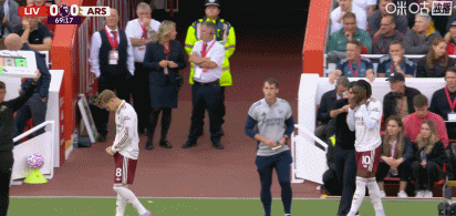 第36分钟,梅里诺角球进攻中倒地,范戴克向裁判表达不满